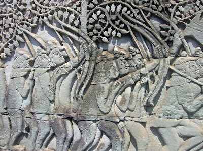 Sul muro cieco della galleria della prima cinta si pipanano decine e decine di metri di bassorilievi divisi in otto sezioni che illustrano lo spiegamento militare khmer el'impresa bellica di Jayavarman VII contro i Cham.